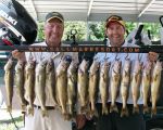 It was day one fishing with Denny, Jim and Jimmy from the Chicago area. We've fished together in the past and have been fortunate to have some pretty good days on the water...and today was no exception! I knew it was going to be a good morning when I caught a walleye demonstrating the technique that's been triggering these ol' marble eyes. In fact...I caught fish on my first four flips of the jig and half crawler, so that was a good sign. We didn't have much wind to move us around, so I had to use the bowmount to slowly move us while we fan-casted a weedline. The fish were on fire again! The average size of the fish was a little smaller than what we had on Monday, but it was a lot of fun nonetheless. It took a while for the guys to get the hang of it, but pretty soon everybody was catching a few fish. We turned our full day charter into a half day, since we had our 20 fish limit by 10:30 a.m. Denny took four fish to the cabin for their supper tonight, the boys will be eatin' good! A beautiful day on the bay and we only saw two other boats out there. Jim and Jimmy had to run some errands, so it was just Denny and I in the picture. Good luck from all of us in the Bay de Noc area! Oh, by the way, the water temperature is 76 degrees and I had a hard time keeping the fish alive. The best thing might be to put a couple bags of ice in your livewell if heading out there. Captain Ken Lee Bay de Noc Charters http://www.baydenoccharters.net
