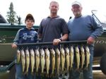 Today I had the pleasure of fishing with John, Eric and Dillon. We started our half-day trip around 5:45 this morning and headed out to do some jigging. Again, we were pitching 1/4 oz. chartreuse jigs tipped with just a 2 inch piece of night crawler. With the water temperature around 75 degrees again the fish wanted a good snap on the jig to get their attention, and that's what seems to be triggering them lately. Both Eric and Dillon had fish on with their first cast of the jig and I thought this was going to be another great day like this past Monday. The fish bit really good for the first three hours of our trip, but the last two hours was tough to say the least. Seems like when the wind started swirling around the fish shut off. We did manage 14 nice walleyes for their family fish fry though. We tried to get that last one for their limit, but the fish just didn't cooperate. We must have let 20 to 30 undersized fish go, and we had a couple of sheepshead too. Overall, not a bad half day trip. With family members coming up today, I hope the fish continue to be on the bite, it's been pretty good lately. Here's a picture of today's catch, good luck from all of us in the Bay de Noc area.