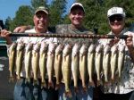 What an awesome morning of fishing today with long time clients Denny, Jim and Jimmy all from the Chicago area. We left the Gladstone Yacht Harbor around 6:30 a.m., had the lines in by 6:45 and had our 15 fish limit by 9 a.m. It was a fast and furious morning trolling Walleyes Choice (http://www.walleyeschoice.com) harnesses behind both in-line weights and bottom bouncers. I-62, I-76, and I-42 did the most damage. Most of the fish were nice chunky 17 to 19 inchers, but we did catch a 23 incher that coughed up a 6 inch alewife and a 3 inch alewife in the livewell. There must have been a decent mayfly hatch again last night, there were many, many spent carcasses on the surface. Nice to have some summer like weather and south winds to keep the warm water in the bay. We caught fish from 15 feet down all the way to the bottom, but it seemed that our bigger fish were coming on the bottom bouncer poles over the side of the boat working the bottom 3 feet. Here's a picture of today's catch, good luck from all of us in the Bay de Noc area. Better get out there and enjoy this weather...who knows how long it will last!