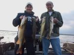 I look forward to this week every year because not only do I get to spend some time chasing other fish than just walleyes, but I get to fish with a couple of great guys that have become really good friends over the years. Patrick Scheidt and Jeff Koopman from the Chicago area and I have been plying the waters of both bays this week. Monday we chased smallies and pike on Little Bay. Fishing was slow, only a few bass and pike. Tuesday we headed to Sault Ste. Marie to fish salmon with a buddy of mine, but the salmon have not shown up yet in any numbers and we got skunked. Wednesday we golfed 18 holes and realized that it's more frustrating golfing than fishing! Yesterday we headed out from Esky around 3 p.m. and the 5-10 mph winds they were forecasting were more like 15 -25 mph so we stayed in the bay and I went back to a technique I used to use many years ago when the wind blows hard and it's impossible to troll, jig, etc. We drifted floaters tipped with crawler halves along sharp breaklines and the fishing was fantastic. We limited out with some really nice fish. Most were in the 18 to 20 inch range, but we did have a 27 1/2 incher that didn't make it after a long hard battle, so we had to keep it. We headed back in at dusk just beating the rain showers. Today we headed to Big Bay and got on the water shortly after 9 a.m. We had an incredible day on Big Bay today with well over 100 smallmouth caught as well as one nice northern. All the fish were released. Nothing big today, I think the biggest bass was around 16-17 inches, but man do they fight. We caught fish on tubes, rattle traps, x-raps, grubs, spinnerbaits, you name it and the smallies were all over it. We saw three or four fish in the 20 inch range that followed us up to the boat, I guess they'll have to wait for next year. It was a strange week, we caught several walleyes on spinnerbaits, pike on tube jigs, and a salmon while casting a husky jerk. Here's a few pictures from the last few days, good luck from all of us in the Bay de Noc area.