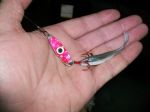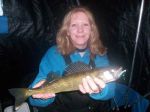 Theresa and I marked more fish than we did last night, but getting them to hit is a whole different story! That said, Theresa finally caught one that was only 13 inches (#7 Clown Rap), but it took ten minutes to get the darn thing to hit! A short while later, I hooked into a pig using a spoon and Gulp minnow (picture) jigging 6 feet off bottom. It turned out to be a little longer than Theresa's big fish last night at 29 inches (though not as heavy). Sorry the video is foggy. Theresa thought just the view finder was fogged up, but it was actually the lens.  A few minutes later Theresa caught about a 16 inch eater to end the evening on a size 8 Holographic Blue/Green Tiger Ice Darter. It was a short time span of no more than a half hour that the fish seemed to be actively feeding. That half hour sure is fun though...