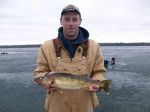 Well, this evening might have been my last day on the ice this season as the ice is going quick!!! If it gets close to 60 degrees tomorrow like they are forcasting, what's left will really go quick. That said, my brother Kenneth, longtime guest (and now good friend) Joe Volpe, good friend Gary Daniels "aka walleyeguy", and Gary's friend Steve gave it a go this evening. Kenneth started it off with a really nice fish while jigging that was 26-27 inches which he quickly released, then Steve landed one about 22 inches on a tip-up, then Joe caught a nice eater. After that it was getting too dark for video. To sum it up, Kenneth caught the one nice one plus one more eater, Steve ended up with 3 eaters, Gary with two eaters, and Joe and I with just one eater a piece. A few throwbacks were caught, but not that many. We did not have nearly as many fish come through as we did earlier in the week. And the ones that did come through, did not seem very active. So all told, 8 eaters and one big one released. If anyone is still planning on going out the last two days of the season, be extra cautious as I can't believe how much ice we have lost just in the last two days!!!