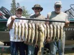 Today's trip was with Hal, Joe and Al from the Munising Michigan area. We left the Gladstone Yacht Harbor shortly before 7 a.m. and headed to where Jay, Tom and I left the fish yesterday. We kept it simple today using Walleyes Choice 1/4 oz. in-line weights and harnesses. The fish were on fire the first couple hours of the day, however getting keepers to bite was the hard part. We did manage 6 or 7 keepers before making a move to some deeper water where we marked some nicer fish. We didn't have our baits in the water 30 seconds and we had a double with one being 22 inches and the other a 28 incher that Hal wanted to keep. I didn't mind after seeing all the blood in the live-well, the fish would not have made it anyways if we had released it. Our best bite for keepers was from 11 a.m. until about 2 p.m., then it slowed some and we headed in. Overall it was a great day on the bay, with close to 40 undersized fish released. By far our best color today was I-76 (http://www.walleyeschoice.com). We also caught quite a few on I-62...which is always good when the fish are feeding on wigglers and mayflies. We ended up with 14 keepers for the guys to take back to Camp. Here's a picture of today's catch, good luck from all of us in the Bay de Noc area!!!