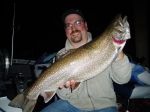 Last night, I decided to try my hand at salmon trolling for the first time this year. Took my buddy Bruce along. We fished from 6 to 9:45, south of Escanaba. We hardly marked anything, and never had a bump. We decided to pull lines at 9:45. We were in the process of bringing in the second dipsey, when one of the leadcores gets hit. It was on my side, so I reeled it in. It didn't fight like a salmon, and when we saw it wallowing behind the boat on the surface, we could see it was a dark greenish/brown. The only thing I could think of was it's a big old channel cat. After it made a couple runs behind the boat, and I got it closer, we realized it was actually a pretty good sized splake! After Bruce netted it and plopped it on the deck, our eyes about popped out of our heads! I've never seen a bigger splake! After we calmed down a bit, and put her on the measuring board, she came in at 30 inches. I've caught one that was longer (32 inches,) but that fish was no where near as fat as this one.