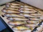 Today I had the pleasure of sharing the boat with a great family from the Gross Pointe area of lower Michigan. Actually Capt. Keith Wils had half of the family and I had the other half. We got on the water at 7 a.m. for a 1/2 day trip, and then they had to head to the little league baseball tournament in Gladstone. Our bite started out pretty good, we were trolling Walleyes Choice bottom bouncers and crawler harnesses in 26 to 30 fow. If all the short fish would have been keepers it would have been a great morning. We ended up with 10 keepers for them as well as some really nice perch. It's so nice to see families enjoying days like this together, it reminds me of when I was young and going out with mom and dad in the boat or spending the day in the ice shanty. I forgot the camera today and didn't get any on the water pictures, but here's a picture of today's catch in the cleaning shack. My best colors today were I-80, I-62 and the ol' standby I-42. Good luck from all of us in the Bay de Noc area, we'll be back out there tomorrow if the winds don't get too strong.