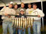 Ahhhh...the second day after the cold front. It's always some tough fishing from my experience. Usually the day of the front and the day after are pretty decent and that next day can be brutal. Yesterday started out that way too. We got on the water around 1 p.m. and there wasn't enough wind to do our drifting, so we got out the trolling gear and trolled with bottom bouncers and harnesses for the first hour and with 9 lines in the water we never had a walleye bite, just a couple of perch hits and that was it. We finally got the wind they were forecasting, and it was enough to start drifting with Walleyes Choice floating jig heads tipped with a 2 inch piece of night crawler. It didn't take too long to realize that we made a smart decision. It wan't a great afternoon of fishing, but we did manage to get 10 nice walleyes and lost three really nice fish at the boat, with one biting us off. We also caught some undersized walleyes and a few perch and lost several fish as well. The wind actually got stronger the closer to dark it got, and we headed in right at 9 p.m. and made a b-line to the Rapid River Pub where the crew filled up on a couple of pizzas. Rick Boyle and the gang were really fun to fish with again, and we didn't do as well as last year, but given the conditions we had I think we did o.k.. It looks like a couple of windy days coming up and some nice warm temperatures, that should get the fish going again somewhere. Here's a picture of the guys and their mess of nice eating sized walleyes. Good luck from all of us in the Bay de Noc area.