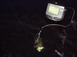 The newer ice is really clear! First pic is my first fish of the night just before it got tangled up in my transducer. It's kinda hard to see, but there's another fish showing on the graph. After unhooking this fish, I dropped the bait back down and caught the second one.