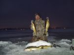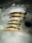 Well, the fishing gods must have figured I've finally paid my dues for this season, and blessed me with an awesome night of fishing! Fished just south of Gladstone in 30 FOW. Was on the ice by 5pm. Didn't mark much until around 5:30. Marked good numbers, but they weren't very active until about 5:45. Apparently that's when somebody rang the dinner bell, and it was on! Between 5:45 and 6:30, I landed 11 walleyes, and lost a 12th! Only two of the fish I landed, and the one that got off in the hole, were undersized! The other nine were 16 to 24 inches. All on #9 Jigging Raps. The first two were on the Glow Hot Perch pattern, and the rest were on Glow Tiger. I was fishing them naked, jigging aggressively about 4 feet off bottom. Considering I was only jigging with one line, (no tip-ups,) I couldn't have asked for a much better 45 minutes of fishing!