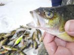 Had a chance to fish with my good friend Capt. Jay Nieman this past weekend. We hit the ice pretty hard for the last 4 days and did very well on the perch during the day and caught a few "eyes" a couple of evenings too. By far the best bait as far as putting numbers of nice fish on the ice was the firetiger "slayer" tipped with either a minnow head or spike. It's a Hali-Style jig that we produce and sell on our ice darter site (http://www.icedarter.net). We've also been testing out some new colors of Ice Darters. I had some baits with some paint chips, so I scraped the paint off and did some powder painting. I had to make my brother's favorite (Red Squiggle) and a few purples for me. The candy purple and the purple demon have been my best so far. We're still not sure if we'll make these colors for next year, we're working out the details. Overall, we had a great weekend...good luck from all of us in the Bay de Noc area.