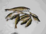 My wife Theresa and I hit an inland lake this afternoon. We caught perch from 26-52 feet deep. Nothing to write home about size-wise, just nice eaters. Also caught a 16 inch walleye. The walleye hit about 3:30 pm shortly after we got out there on a #5 GGT. Might have caught more perch if I had remembered to take some perch minnows!!! I caught all my perch on the #5 GGT while Theresa caught hers on a teardrop and waxworm. She had a bunch come unhooked too. Upon getting back to the truck, I noticed she still had a very tiny jig on her pole from the last time we fished bluegills and I think that was her problem with not getting good hooksets. It was too small for the perch. All in all, a nice afternoon