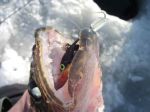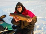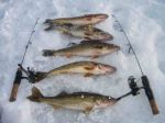 We had a pretty good evenings fishing tonight. Could have had a little less wind though since we were just sitting outside on buckets. Anyway, I was fishing with guest Joe Volpe, his son Brandon, and my brother Kenneth. My brother limited out (what a putz!). Joe and Brandon caught 4, and I caught 3. So 12 walleye total. They were all just good eaters with the exception of a nice 24 inch male. Right after landing the big male, I hooked another really good fish, but it came off! Oh well, that's part of fishing too. My brother hooked his first walleye on an Ice Darter that he painted up like a blueberry muffin with a purple top and a chartreuse bottom. I know Kenneth caught some on Firetiger too. I think Joe and Brando caught all theirs on Firetiger as well. I caught my three on the #9 Glow Jigging Rap. All in all, a very nice evening on the ice...
