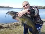 No boards, no linecounters, no leadcore, no gps and a lot less hassle! That's part of the appeal of catfishing for me. A few hooks and sinkers and some cut up sucker and you are good to go! My wife Theresa and I went for a ride to the Menominee River to see if the cats are active yet. The first place we fished she had on a nice pike which did a quick release right at shore, so that worked out nice. It was probably 33-34 inches. No cats here. The 2nd spot was good for one cat. We have caught much bigger, but a decent start none the less. Had high hopes after catching that first one since we hadn't fished our best spots yet. We kind of have a "milk run" of spots we hit when fishing from the bank. We fish a half hour to forty five minutes or so, then on to the next spot. Well, sometimes the best laid plans do not always work! Our last 3 spots were worthless due to high water. These spots are normally holding areas for the cats to rest up before shooting over another long riffle. But with the high water, there isn't any shallow riffles now!!! So nothing to keep the fish in the holes. Oh well, it felt good to sit along the river and soak up the sun. Don't think I'll have any trouble falling to sleep tonight because (as the picture shows), this catfishing is a lot of work...