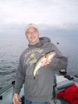 Set up outside the main group fishing off the river mouth and started catching fish right from the start. Nothing special, just crawler harnesses behind 1/2 ounce bottom bouncers. Color didn't matter. If it moved, they ate it! Just for the heck of it I put an orange Senko on one of the harnesses, and caught just as many fish on that rig as the ones with the crawlers! Caught several fish as we were letting the line out behind the boat. Several doubles and one triple, (not bad considering we were only running 4 lines.) By the end of the trip we easily boated between 40 and 50 fish, with all but a few of them being legal sized.
