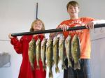 Today's trip started out very sloooooooooooow.  We headed out of the Gladstone Yacht Harbor around 6:30 a.m. and went right back to the place we left fish yesterday, however the fish were nowhere to be found.  We were fishing along the East bank in 28 feet of water, but the fish must have moved elsewhere.  We only made one pass trolling harnesses behind bottom bouncers before making a change.  The wind was blowing just enough to break up the sunlight in the shallows, so we decided to pitch jigs along a weedline and also drift with floating jigs tipped with 1/2 crawlers.  With 5 people in the boat you have to be a little creative in order for everybody to have an opportunity to catch fish.  Two of us sat in the front and pitched 1/4 oz. jigs and the other three sat in the back drifting with the floaters.  Both methods produced fish.  By 10 a.m. we had 6 nice walleyes and some beautiful smallies.  They kept two bass and I released a 17 incher and a 21 1/2 incher, one of the biggest I've ever caught.  The rain came, so we headed back to the resort for a while to look at the radar, eat a bite, and make a plan for the afternoon.  Don and Char were the only two that went back out, however after only one drift along our weedline it was getting pretty rough and they were ready to call it a day.  We did manage to pick up 3 more nice walleyes, so we ended up with 9 for the day and some nice bass.  Not too bad for only about 4 hrs. of actual fishing time.  They've been fortunate to eat fish every night they've been up here, maybe tomororw we can get a few for them to take back home.  Good luck from all of us in the Bay de Noc area.  Here's a picture of the morning's fish right before I cleaned them, and another beautiful sunrise over the Bay!!!