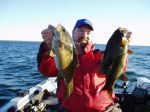 I got out briefly Monday evening for a quick bass trip along the West Bank. Wind was still howling at the start of the trip, but it was enough out of the west to keep the wave heights reasonable. In a hour and a half of fishing, I boated 7 smallies, lost 4 more, and even caught a walleye, (normally not unusual, but that's the first one I've caught in a couple weeks of dragging suckers!) Second drift I doubled up on 19 and 19 1/2 inchers, (the two big fish of the trip.) By the third drift, I had to pull in the drift sock because the wind had died to almost nothing, (trollers should have had a good night on the upper bay.) Three of the bass , and even the walleye, showed obvious signs of being hooked before, (released tournament fish?)