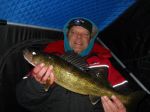 If they would just bite, and if they would just stay on the hook, I would have had my limit this evening. But all of them didn't bite, and they didn't stay on the hook either!!! Theresa and I got on the ice about 4:00 fishing in 36 feet of water and it was dead until about 6:00. Finally a nice fish showed on the graph and I fussed with it for about 5 minutes getting the darn thing as high as 10 feet off bottom, but just could not get it to hit the green glow tiger. I then switched over to a code four upside down secret CIA edition prototype lure. That's code for a #9 Parrot Jigging Rap that I painted the top purple... So the lure wasn't down 5 minutes when a 22 incher smoked it. I was fishing outside and ran to the shack for a picture and also to tease my wife since she didn't think I would ever catch a fish because of the tacky paint job I did. So I get back to my hole and as soon as I dropped the lure back down I had another nice fish take a look. This one too would follow it way off bottom, but not commit and finally swam off. Fish #4 smoked it again and I got it to the hole just to have the jig get stuck on the ice and the fish come off!!! It looked like the 22 incher's twin. Had 4 more fish come thru that I could not get to hit before it ended. It was still a pretty fun half hour or so. For whatever reason, Theresa only marked a couple fish and only had one hit that she missed. I just finished eating my fish, we'll see what Theresa has to say about that in the morning...
