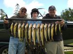Well...I give credit to anybody that was out fishing yesterday in that brutal Northwest wind. The forecast was calling for 5-10 mph...but when are they ever right, huh? Boat control was very tough, and to make things worse, the fish we've been catching lately were not in a biting mood for the first few hours of the trip. I had the pleasure of fishing with Steve, Rachel and Matt...and they got to see first hand how weather affects how and where we fish. On a 5 hr trip you only get to really fish about 3 or 4 spots, and yesterday the 4th spot was the charm. We only had one keeper walleye and a few decent perch by 11 a.m., and then we made a move to an area that's been holding fish, but is also tough to fish because of many snags. In the last hour of our trip we put 9 more really nice walleyes in the livewell and it ended up being a pretty decent trip despite the nasty conditions we were faced with. All but one keeper came while trolling Walleyes Choice (http://www.walleyeschoice.com) harnesses behind bottom bouncers in 21 to 25 feet of water. The wind had the fish pushed right up to the bank, and a few were suspended off the sharp bank. I-110, I-78 and I-42 caught all the fish and we lost about 6 harnesses and bottom bouncers to the snags too. We work very hard at trying to get fish...and yesterday was one of those days you just had to keep working to figure them out. Here's a picture of our catch, some very nice fish yesterday, good luck from all of us in the Bay de Noc area.