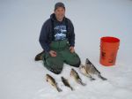 Ray and I hit the ice again today on our day off and it wasn't too bad. We got on the ice just at daylight and planned on fishing the whole day. We decided to go back to our deep water spot from last week and see if the fish were still there. While I was setting up my shanty I had my first flag of the day, so that pretty much gave us our answer. The spool was spinning pretty good when I got to it, but just as I went to set the hook the fish dropped it. Then there was a pretty good lull in the action except for a couple more flags and drops and some small pike and one 17 1/2 inch keeper I got jigging. My best bite came from noon until 2 p.m. During this two hour span I landed one keeper walleye on a tip-up, and 3 more jigging to go with the keeper I caught jigging earlier in the morning...and that filled out my limit, so by 2 p.m. I was done. My fish were 17.5, two at 18, a 19.5 and a 22. It just so happened that the moon came up about then...and the bite pretty much died. We had some more pike on tip-ups but that was it. I had to leave a little early, and headed in shortly after 4, but Ray said the rest of the evening was slow. Ray got one keeper jigging and some pike on tip-ups and lost 4 decent fish jigging. I've noticed the same thing while in the boat, when the sun and the moon are out at the same time it seems like the bite slows and that's exactly what it did for us today, at least where we were. Every fish I caught jigging today was on a #9 parrot jigging Rap. Tried several other sizes and colors...but that was the one they wanted. Good luck from all of us in the Bay de Noc area!