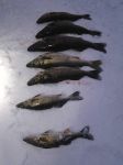 I have been catching most of the fish on 7's and 9's in purple glow tiger, parrot, fire butt, green goblin and also on tip ups